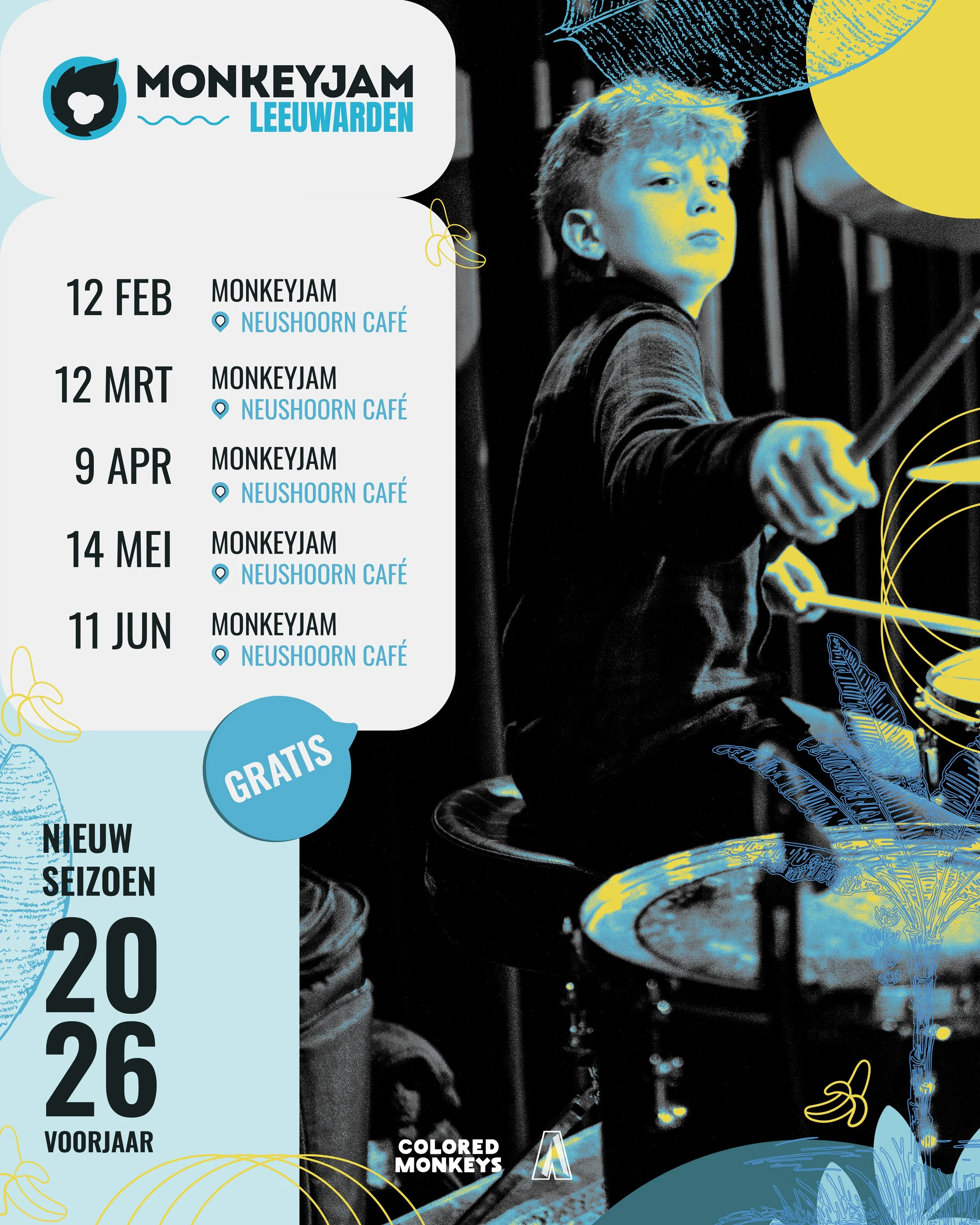 De MonkeyJam in Leeuwarden vormt een eigen community, maar is tegelijkertijd volledig verbonden met de Colored Monkeys-familie: een netwerk van muzikanten die samen bouwen aan een open, creatieve en inspirerende muziekscene.