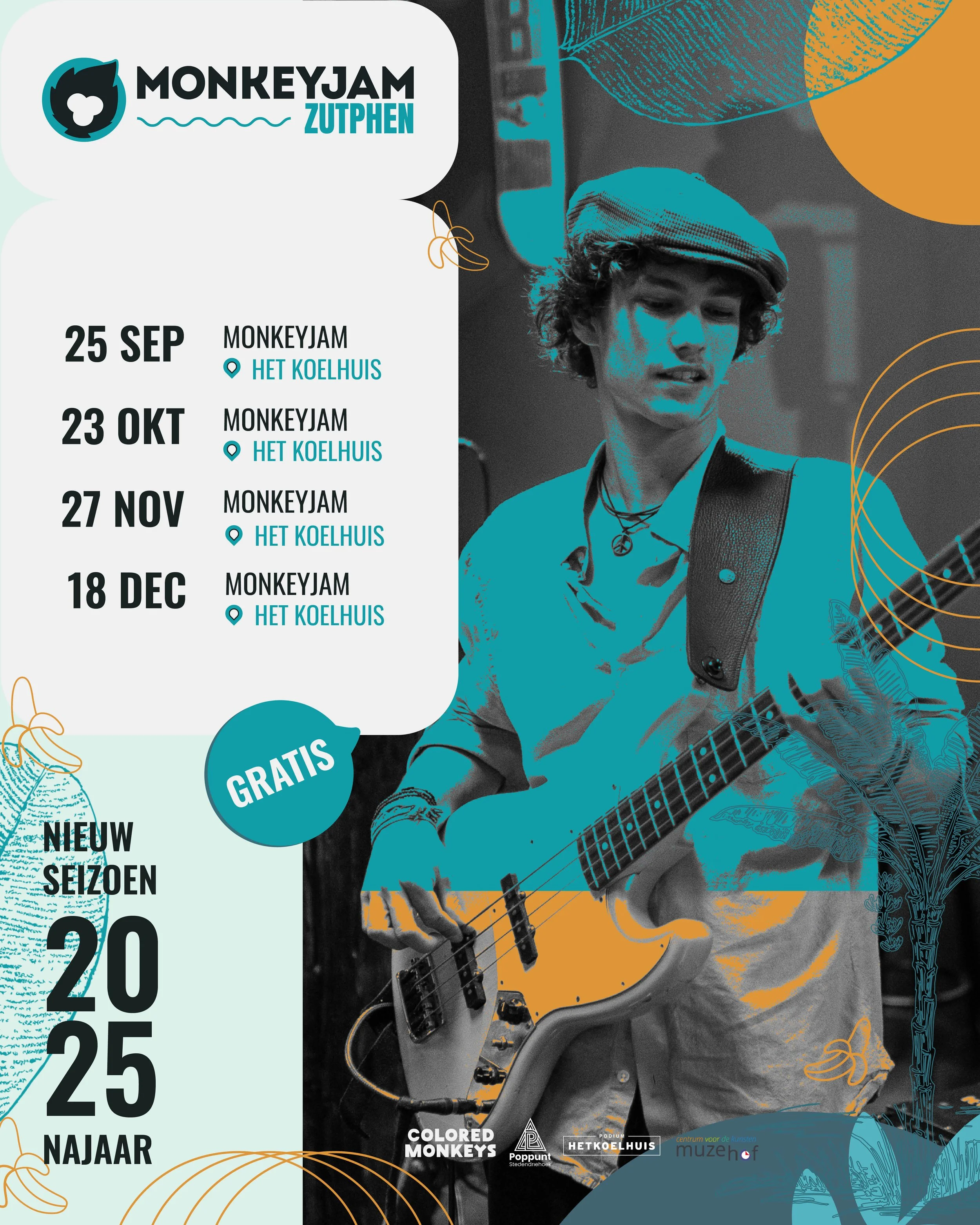 Sinds september 2025 is ook Zutphen een MonkeyJam-stad! Elke vierde donderdag van de maand verandert Het Koelhuis in een muzikale speeltuin waar muzikanten van alle leeftijden en niveaus samenkomen om te experimenteren, improviseren en inspireren.